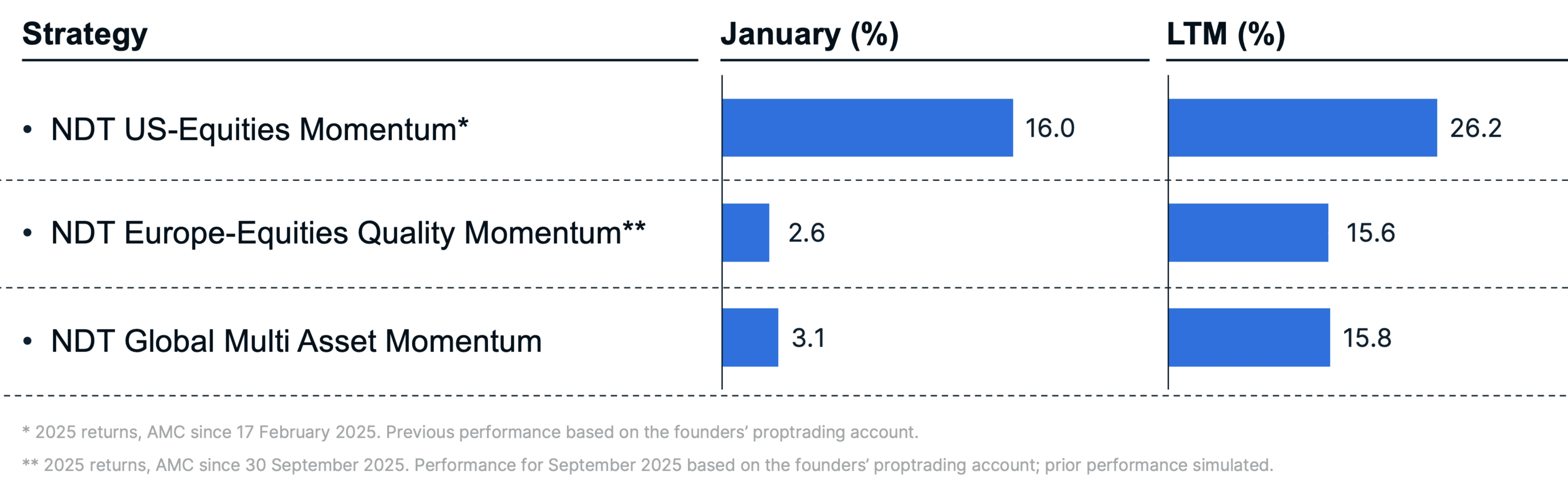 The NDT US-Equities Momentum strategy delivered a +16.0% return in January, significantly outperforming its benchmark, which returned +0.9%. The NDT Europe-Equities Quality Momentum strategy rose +2.6%, slightly trailing its benchmark’s return of +3.0%. The NDT Global Multi Asset Momentum model returned +3.1%, compared with +1.7% for its benchmark.